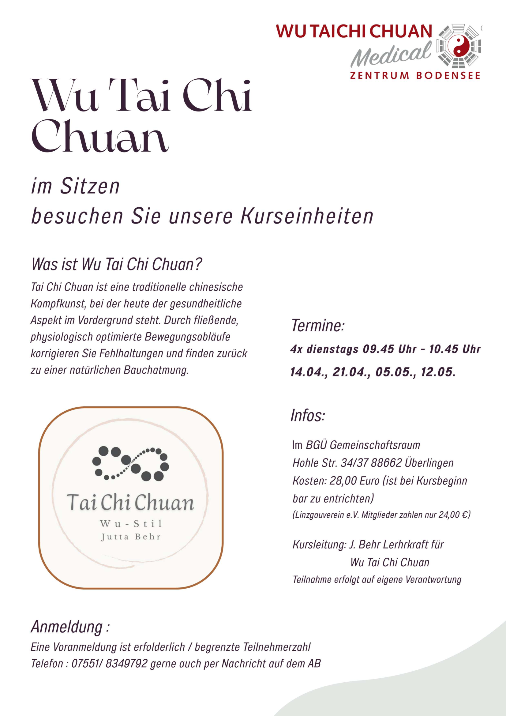 Wu Tai Chi Chuan im sitzen Wann April 14, 2026 09:45 - 10:45 Zum Kalender hinzufügen ICS herunterladen Google Kalender iCalendar Office 365 Outlook Live Veranstaltungstyp Gesundheit Jutta